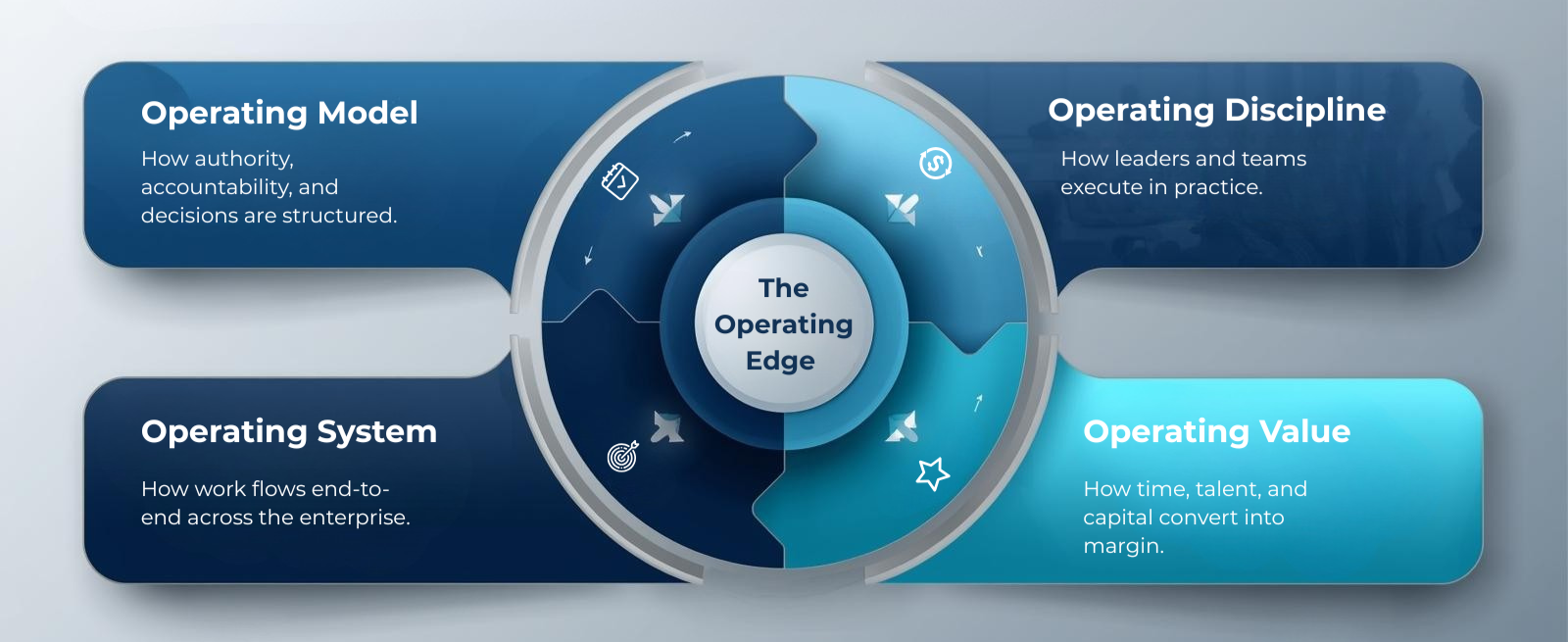 Our work is grounded in one integrated framework — The Operating Edge — that aligns the enterprise across four dimensions: